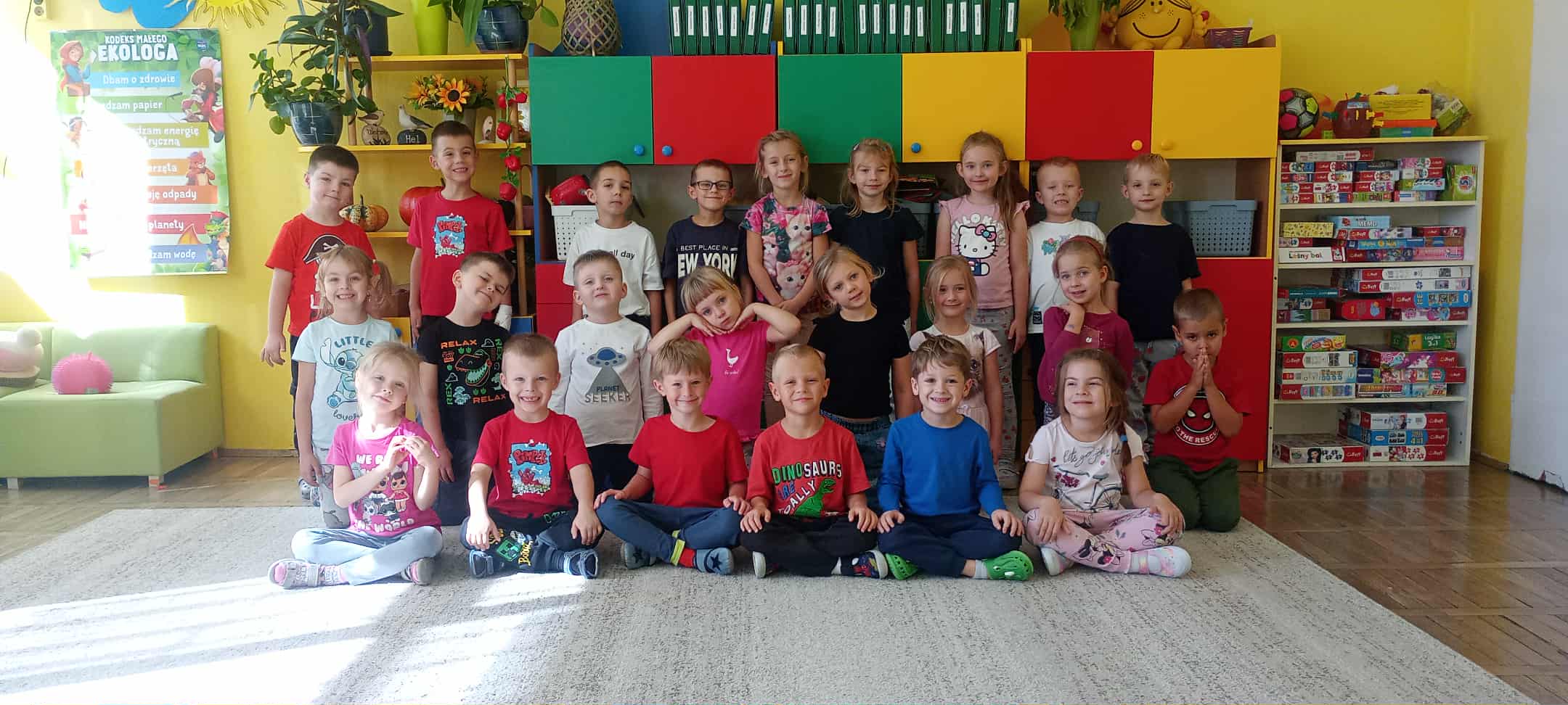 Jesteśmy jedną z grup „starszaków” w przedszkolu. Świetnie się znamy i chętnie ze sobą przebywamy. We wspólnej zabawie i nauce pomaga nam Pani Ela i Pani Beata. Zabawy na terenie przedszkolnym to super sprawa. Jak na mądre starszaki przystało, jesteśmy już bardziej ostrożni. Wiemy, że trzeba uważać, żeby nie skrzywdzić kogoś ani siebie podczas zabawy.